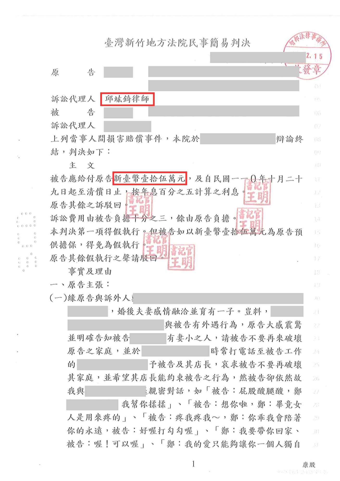 邱竑錡律師侵害配偶權訴訟,獲賠 15 萬-訴研